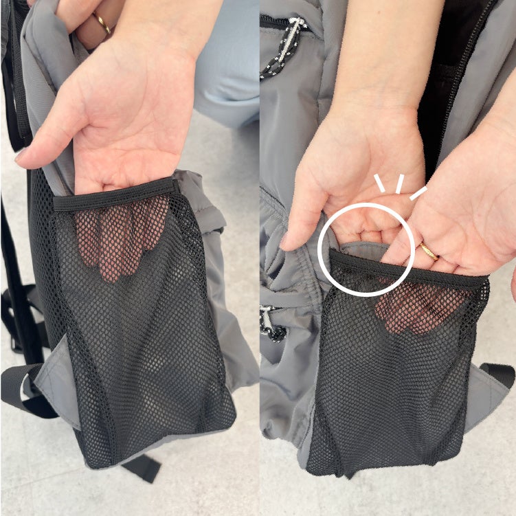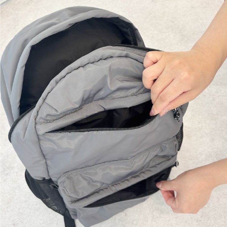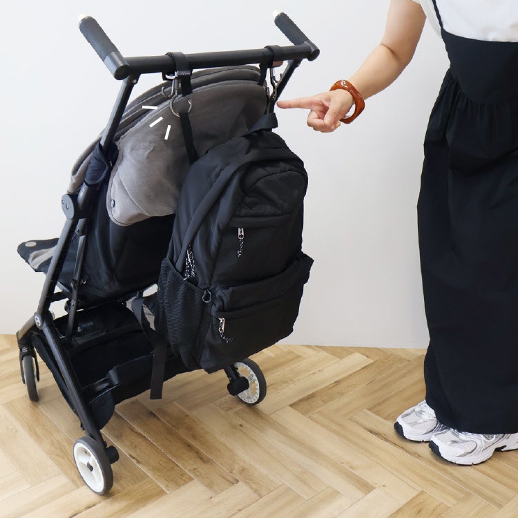 リュック本体には背面ファスナーやボトルホルダー、PCとタブレット用のポケットなどが備わり、荷物が多くても安心な機能を多数搭載しています。また、ベビーカーフックに掛けられる便利なループ付きデザインも特徴の一つ。マザーズバッグとしてはもちろん、通勤バッグとしても活躍する、子育て世代に嬉しいアイテムです。