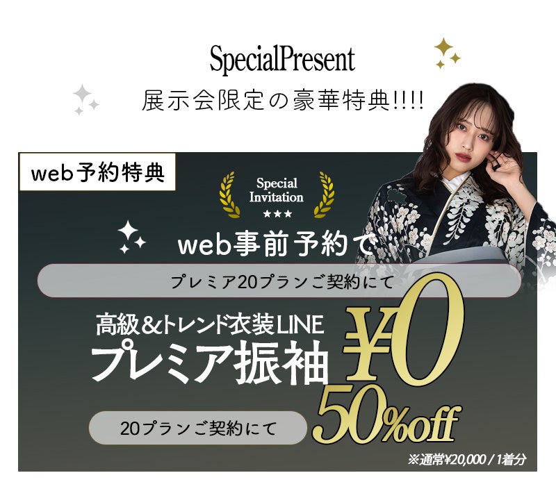 4月1日より受付開始!2026年3月の卒業袴レンタル。今回の展示会では、成人式プランと同時契約いただくと卒業式プランが50%OFFになる特大セールを実施中です。