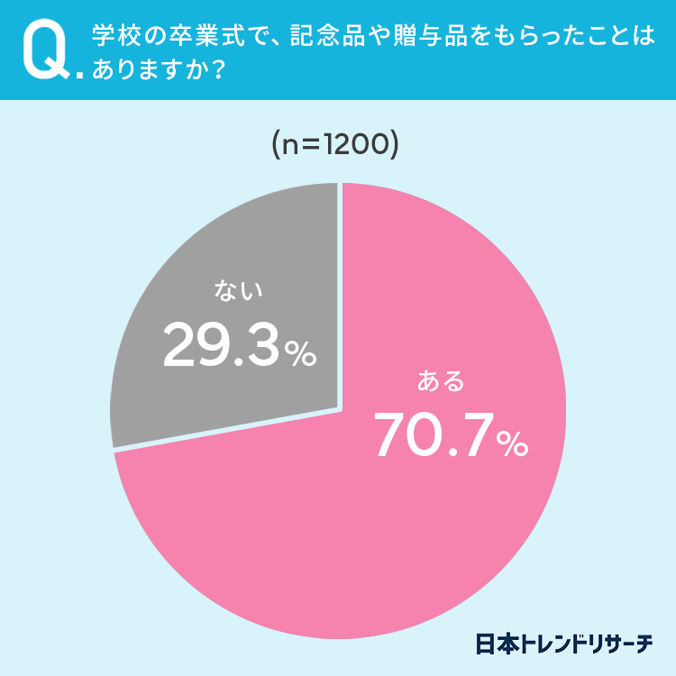 70.7%の方が、小・中・高・大学などの卒業式で「記念品や贈与品をもらったことがある」と回答しています。