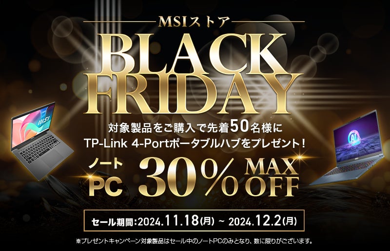 MSI公式オンラインショップ『MSIストア BLACK FRIDAY』 最新モデルを含む対象ノートPCが最大30%OFF! 対象製品購入で先着50名様に4-Portポータブルハブをプレゼント!!