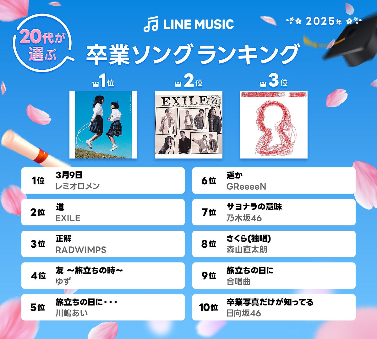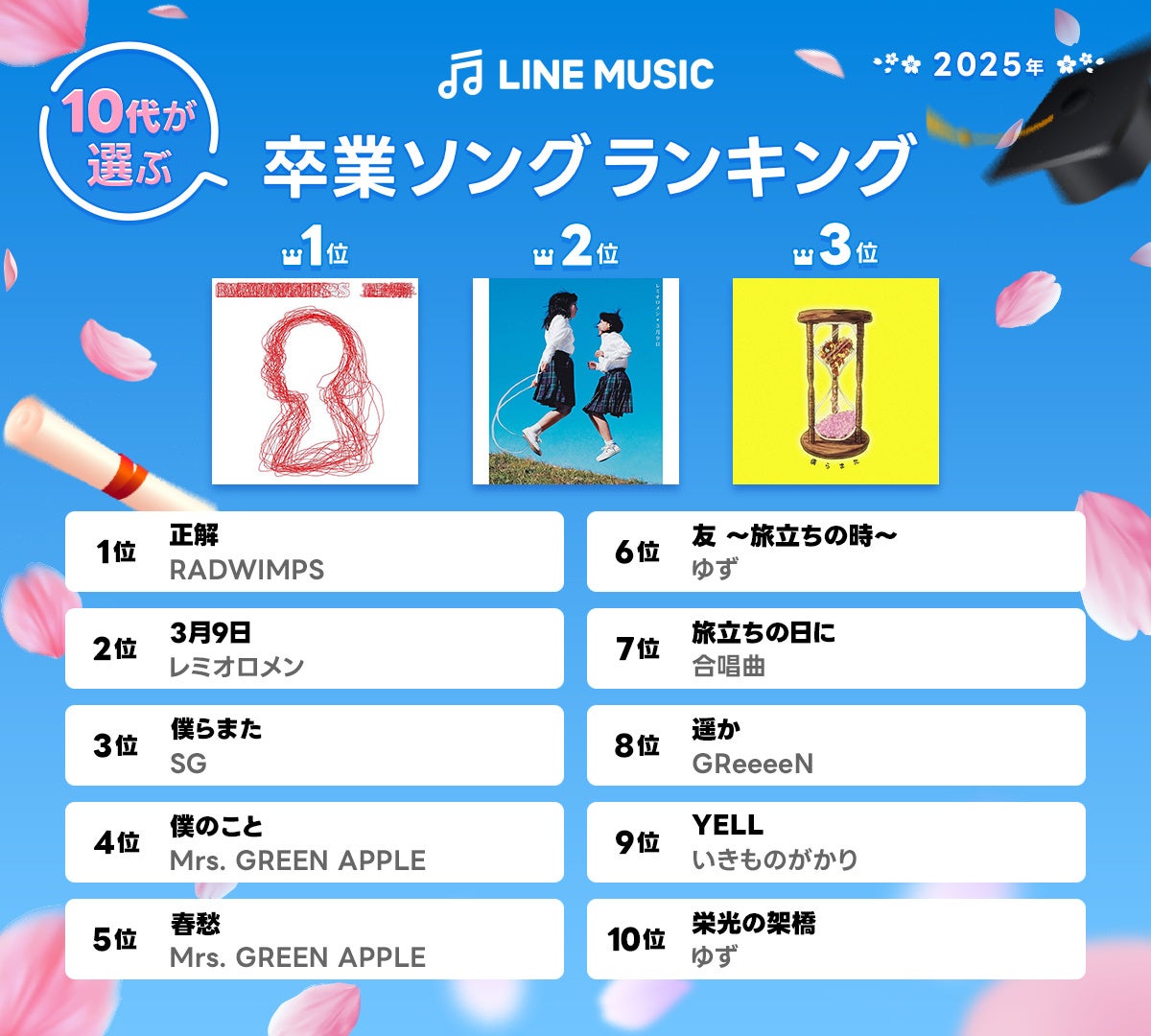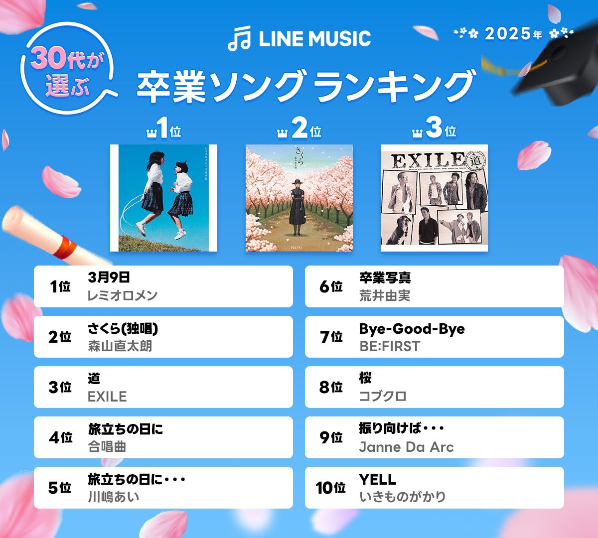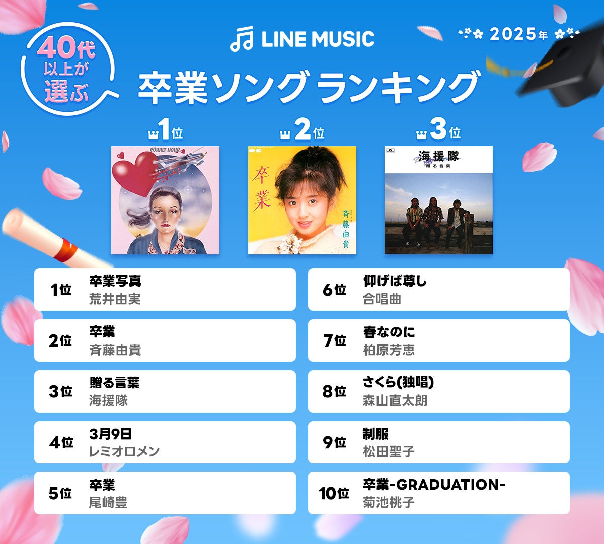 LINE MUSIC株式会社は、当社が運営する音楽ストリーミングサービス「LINE MUSIC」(iPhone・Android対応)において、2025年版の世代別「卒業ソングランキングTOP10」を発表します。