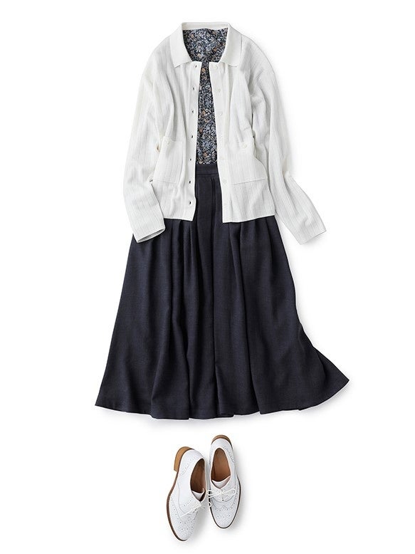 季節の変わり目の味方、カーディガン。白なら初秋スタイルにぴったりな程よい抜け感も演出してくれます。草花や鳥モチーフがプリントされた、アンティークなブラウスに、タックがランダムに入ったボリュームスカートでドラマティックにまとめて。