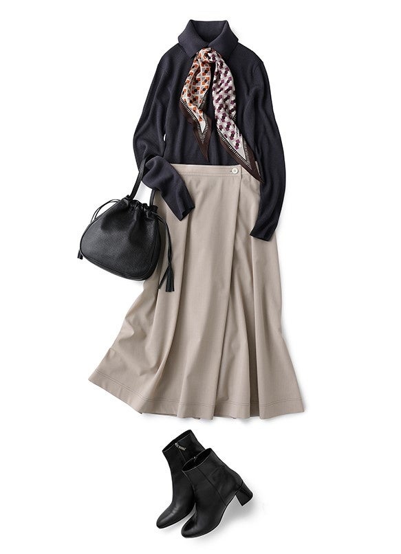 リブニットタートルに合わせるのはたっぷりフレアのキュロットスカート。メリハリのある女性らしいシルエットです。カラーもグレートーンにすればアンニュイな大人の雰囲気に。仕上げにスカーフをひと巻きすれば顔周りもパッと華やぎます。