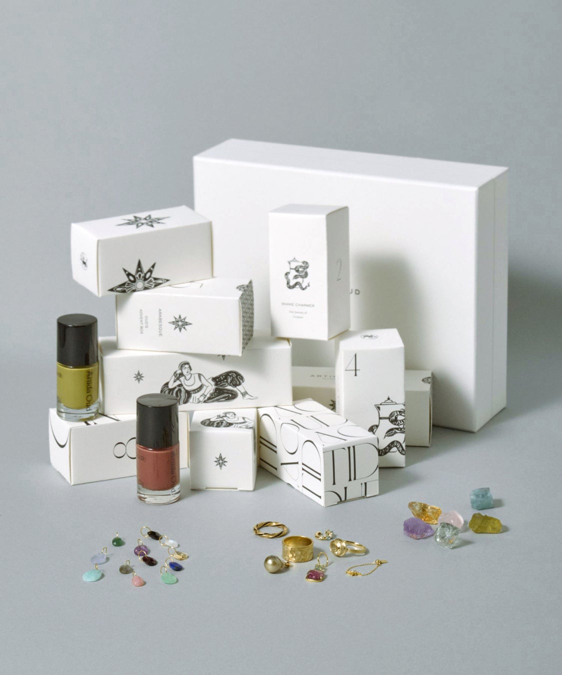 アドベントカレンダー限定でご用意した、六芒星を象ったモチーフにホワイトダイヤモンドを配したチェーンリング。そのほか、アーカイブジュエリー、ネイルポリッシュ、お守りの原石、ストーンチャーム、ジュエリーケアグッズ、計10点がBOXに隠されています。