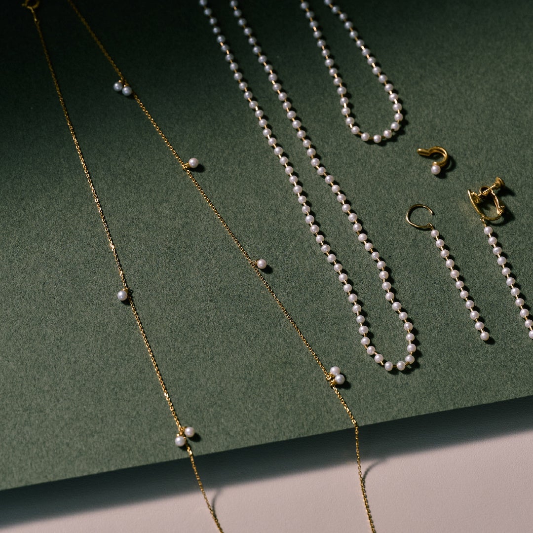 なめらかな曲線を描くネックレスやブレスレット、直線上に連ねたモダニティ溢れるピアスやイヤリングをご用意しました。