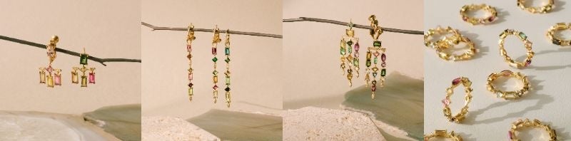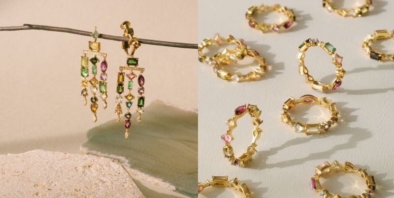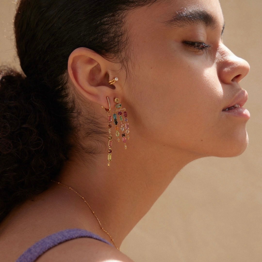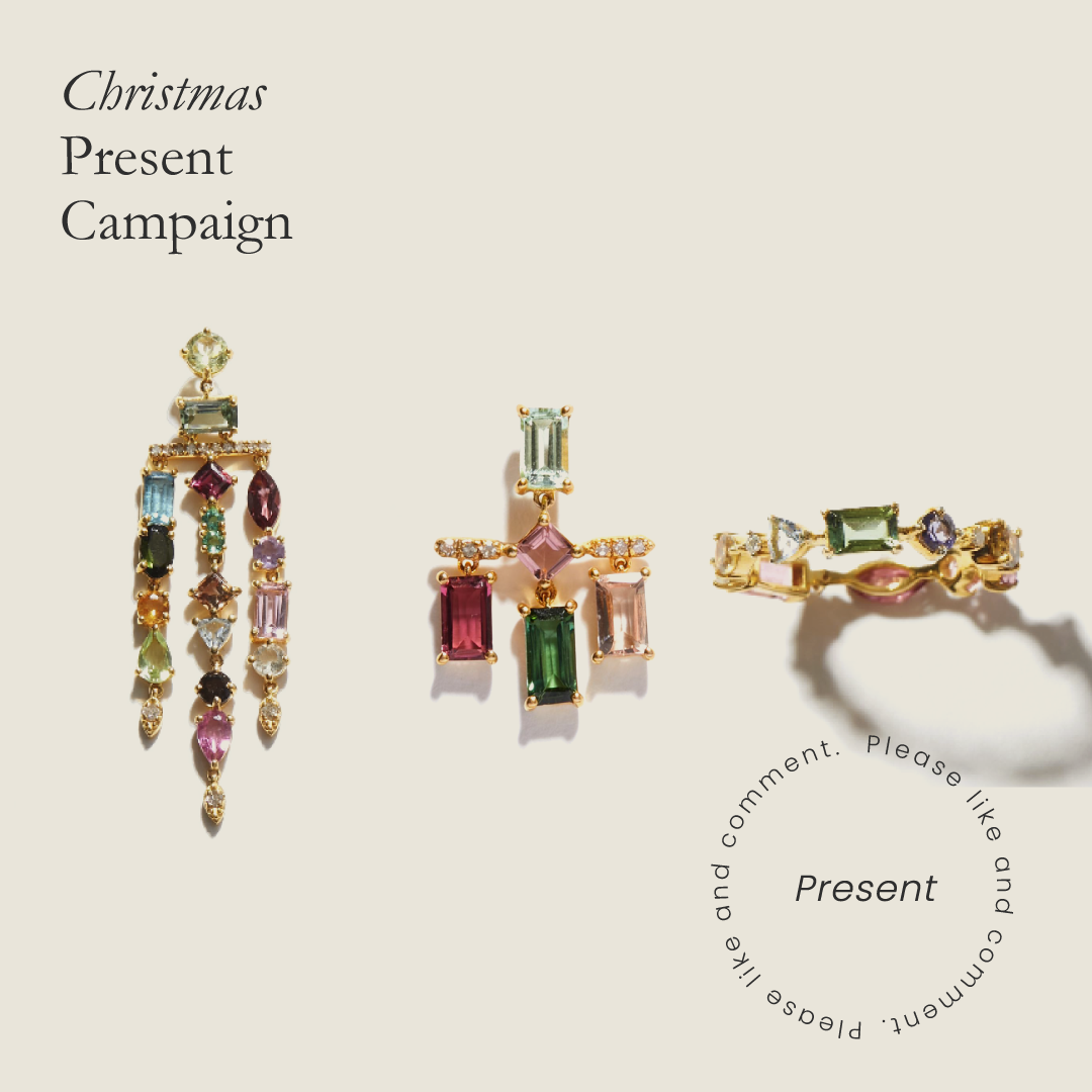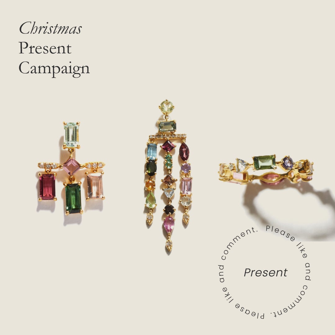 絢爛な輝きを放つ、色とりどりのマルチトルマリンの連ねたシャンデリアピアスやエタニティリングをプレゼント。詳しくは公式instagramをご覧ください。