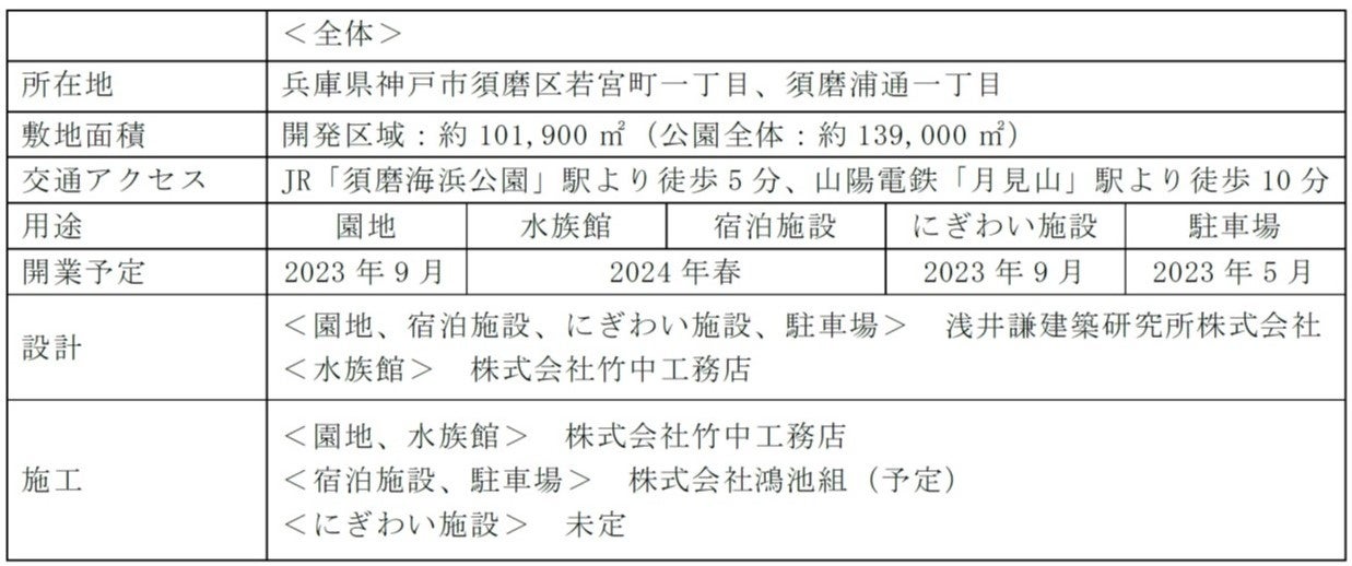 本件は、JR神戸線「須磨海浜公園」駅より徒歩5分に位置する須磨海浜水族園・海浜公園をPark-PFI制度を用いて、園地、水族館、宿泊施設、にぎわい施設、駐車場で構成される新たな施設に再整備するものです。再整備にあたっては、「地域コミュニティと観光客が交流する“つながる”海浜リゾートパークの実現」をテーマに掲げ、神戸市民の方々を始め皆様に愛される公園の利便性・快適性を高める「コミュニティ・パーク」と観光客誘致を目指す「デスティネーションリゾート」を調和させ、多様なつながりと交流を生むような場所と仕組み作りに取り組んでまいります。