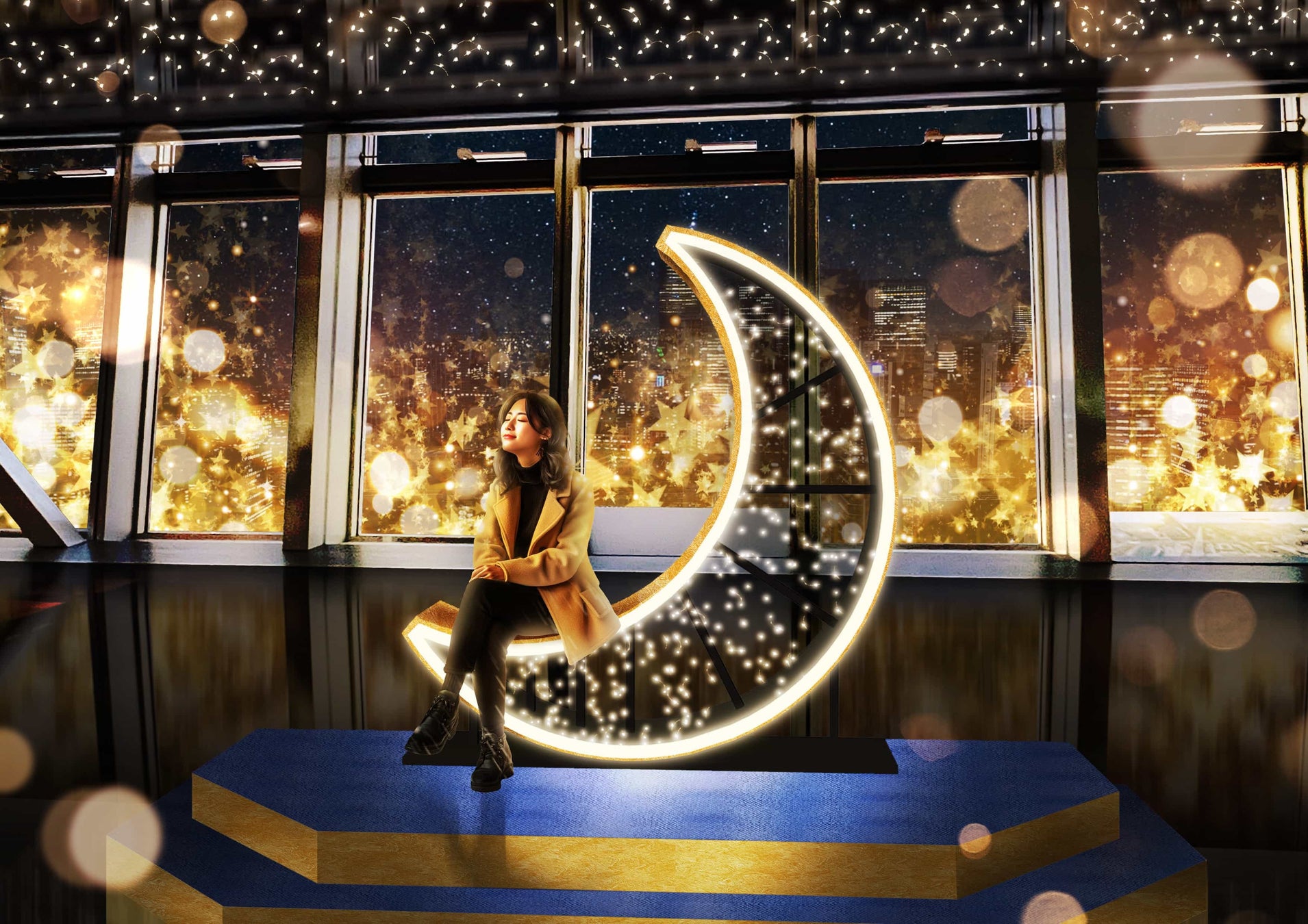 期間中は、タワーのあちらこちらがシャンパンゴールドの星空に包まれたイルミ空間に。メイン演出エリアとなる、地上90mの展望台「スカイデッキ」では、窓面全体に星座や流れ星が次々と現れるプロジェクションマッピングショーはもちろん、星空が降るような没入感を感じられるイルミネーションが天井に新登場。マッピングショーと連動したイルミネーションの光が、名古屋の夜景を華やかに彩ります。マッピングショーを楽しんだ後は、まるで夜景に浮かんでいるような三日月のベンチで写真撮影をしながらゆったりとお過ごしいただけます。