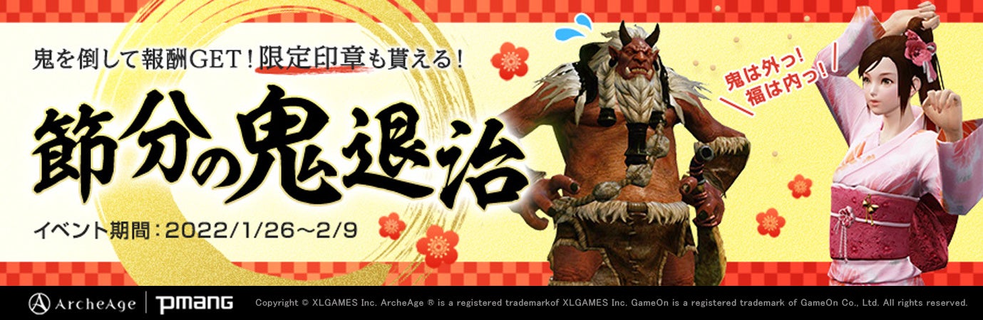 株式会社ゲームオン[本社:東京都渋谷区、代表取締役社長:李 相燁(イ サンヨプ)] は、超大型MMORPG『ArcheAge(アーキエイジ)』において、2022年1月26日(水)より、鬼を退治して福を呼び込む新イベント「節分の鬼退治」や、3vs3のチーム戦で競うイベント「スリル満点ぶるぶる雪合戦祭り」を開催いたしました。