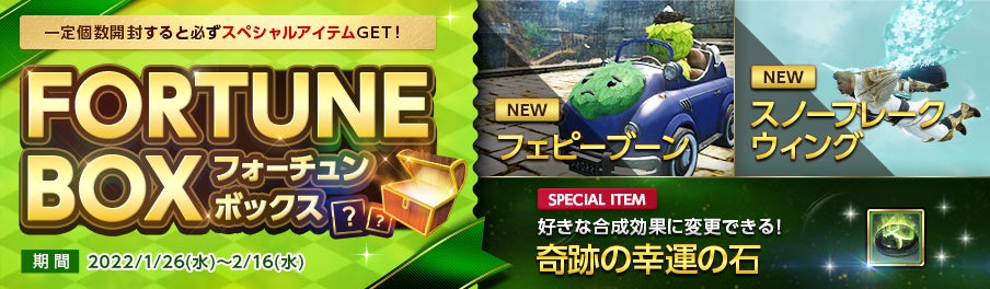 当ボックスからは、人気キャラクター“フェピー”のモチーフがあしらわれた新登場の車両「フェピーブーン」や、雪の結晶が煌めく美しいウィング「スノーフレークウィング」などのアイテムがランダムで獲得できます。