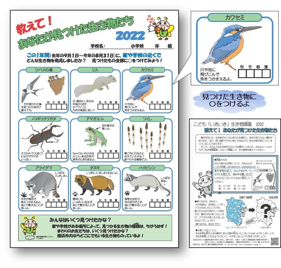 令和4年の夏休み前に横浜市立小学校340校の5年生29,003人(令和4年5月1日現在)に調査票を配布し、過去1年間に「家や学校の近く」で見つけたり、鳴き声を聞いたりした生き物に対して○をつけてもらいました。