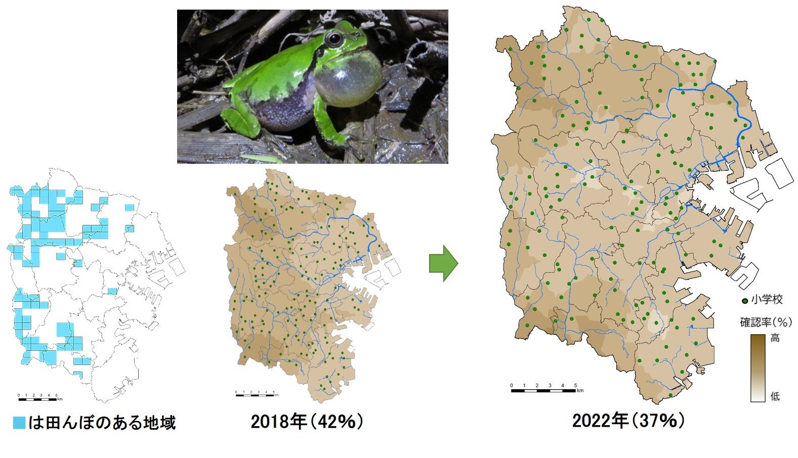 過年度調査までは、市全体の確認率が上昇し、生息範囲の北上や拡大などの変化が示唆されましたが、今回の結果は2019年の結果とほぼ同じで、生息拡大は落ち着いているように見えます。市北部を西から東へ流れる恩田川や鶴見川などの大きな河川が生息拡大を制限している可能性があります。