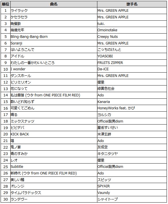 ■カラオケ特別賞 「カラオケ・オブ・ザ・イヤー powered by DAM & JOYSOUND」 J-Pop部門 中間結果(30曲)