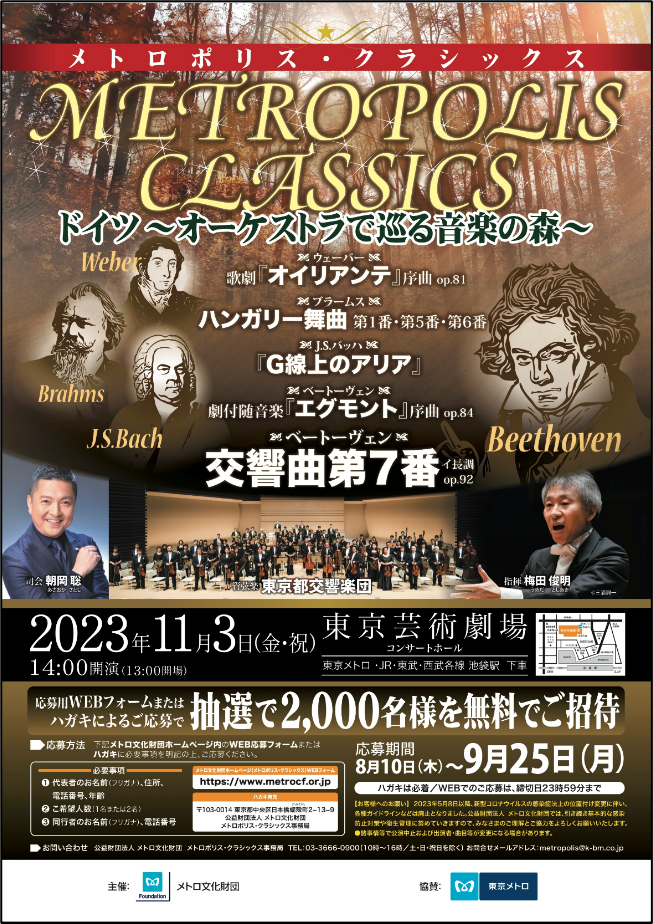 「メトロポリス・クラシックス」コンサートは、お客様に気軽に楽しくクラシック音楽に触れていただくことを目的として、メトロ文化財団が主催となり開催しているコンサートです。東京メトロは2006年から協賛しており、今回で18回目を迎えます。今年は抽選で2,000名のお客様を招待し、東京芸術劇場コンサートホールにて開催いたします。