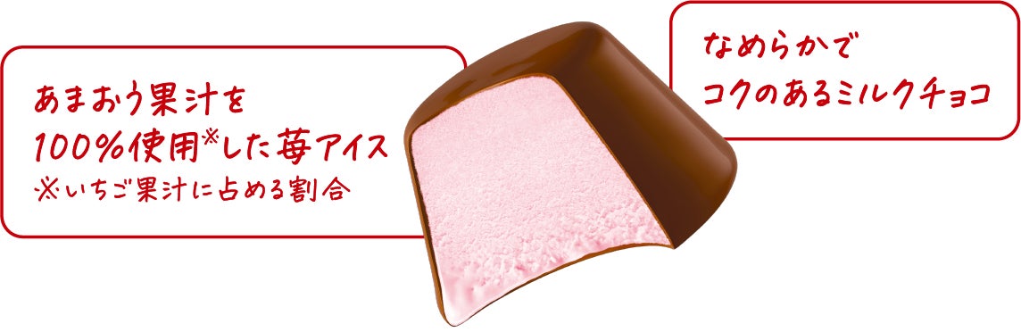 ①あまおう果汁を使用した苺アイスを、なめらかでコクのあるミルクチョコでコーティングした、ひとくちアイスです。