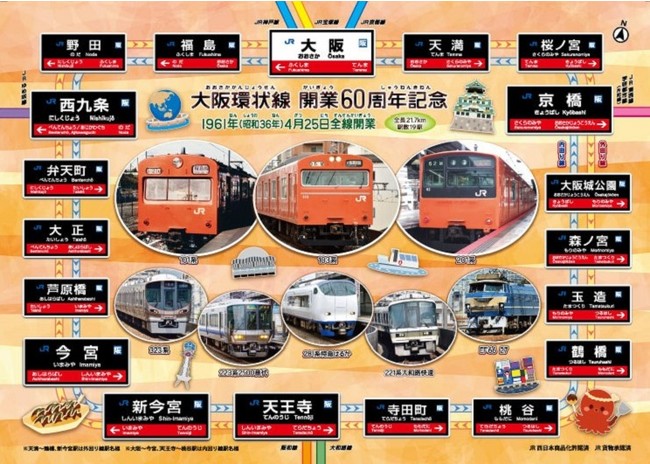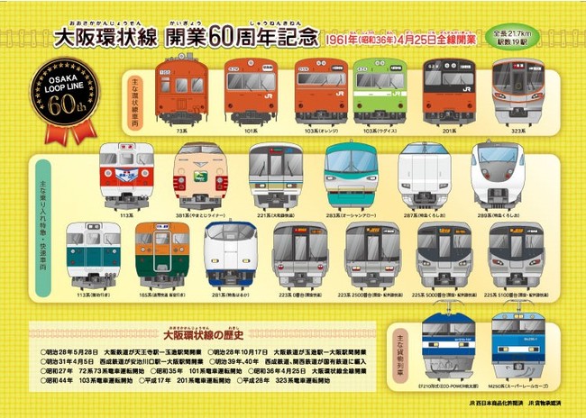 サンケイスポーツ(産経新聞社発行)は、「大阪環状線」が4月25日で開業60年を迎えたのを記念し、JR西日本、JR貨物承認の記念下敷き『環状線車両と仲間たち』(B5判2枚組み、税込み1200円・送料別途)を発売しました。電話またはインターネット( https://www.sanspo-kansai.com/ )で購入できます。