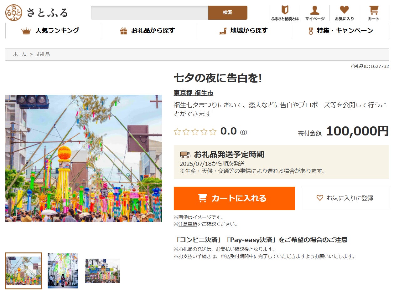 「さとふる」にて、2025年8月に開催される「福生七夕まつり」の場内アナウンスを通じた告白やプロポーズ、PRができる体験型お礼品の寄付受け付けを、2025年7月4日より開始することをお知らせします。なお、「福生七夕まつり」に関するふるさと納税のお礼品が登場するのは今回が初めてです。