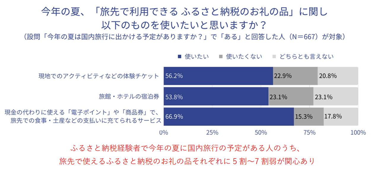 ふるさと納税経験者で今年の夏に国内旅行の予定がある人のうち、旅先で使えるふるさと納税のお礼の品それぞれに5割~7割弱が関心あり |