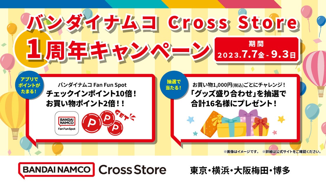 「バンダイナムコ Cross Store」の誕生1周年を記念して、東京店、横浜店、大阪梅田店、博多店で「バンダイナムコ Cross Store」1周年キャンペーンを7月7日(金)から9月3日(日)まで開催します。「バンダイナムコ Fan Fun Spot」アプリで、今だけ来店ポイントが10倍(通常3pt→30pt)、お買い物ポイントは2倍(通常100円ごとに1pt→2pt)、さらにお買い物1,000円ごとに参加できる、「グッズ盛り合わせ」が抽選で合計16名に当たるダブルチャンスキャンペーンも実施します。詳細はキャンペーンページをご覧ください。