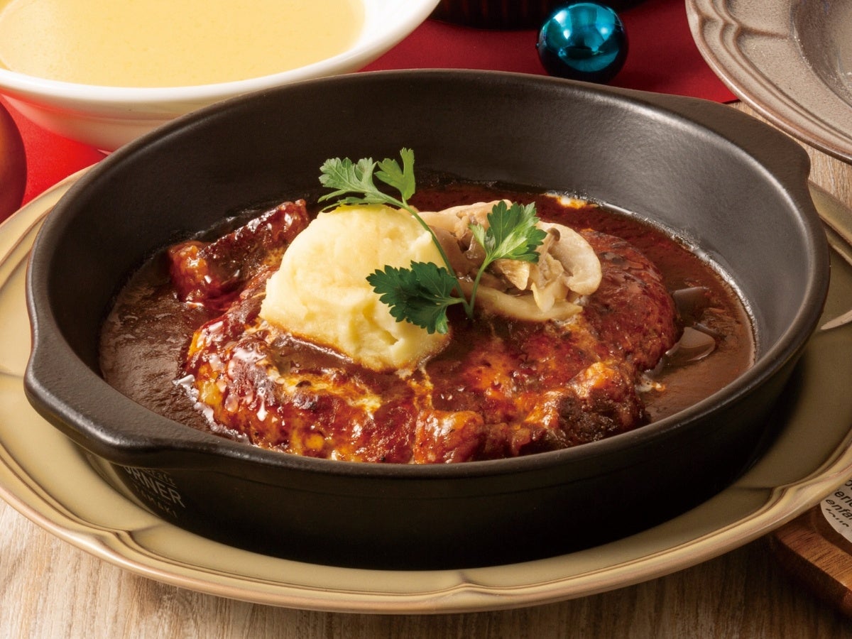 牛肉100%の旨味を閉じ込めたふっくらジューシーな粗挽きパテとじっくり煮込んだ自慢の濃厚シチューソースの贅沢ハーモニーをお楽しみください。