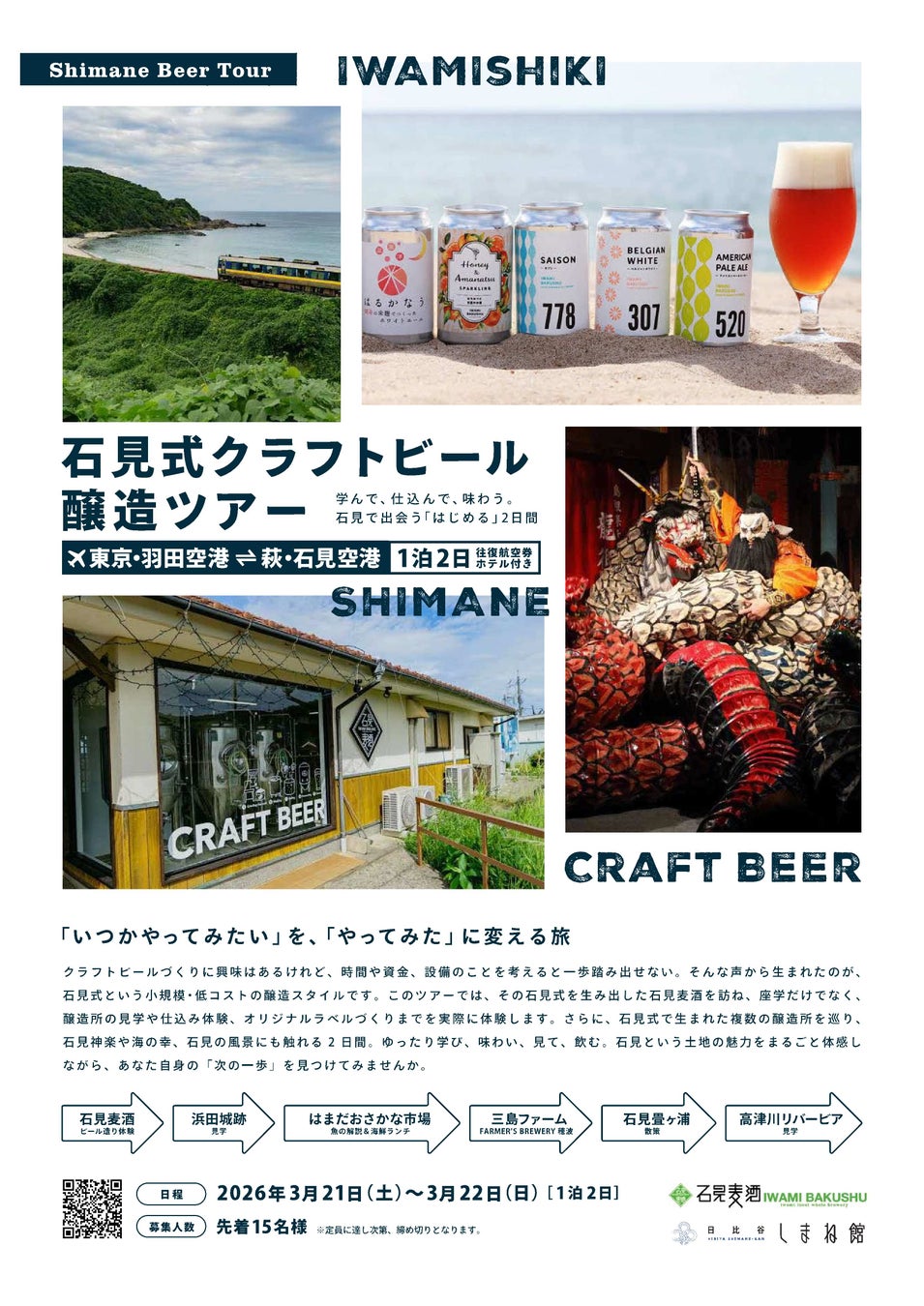 クラフトビールづくりに興味はあるけれど、時間や資金、設備のことを考えると一歩踏み出せない。そんな声から生まれたのが、石見式という小規模・低コストの醸造スタイルです。このツアーでは、その石見式を生み出した石見麦酒を訪ね、座学だけでなく、醸造所の見学や仕込み体験、オリジナルラベルづくりまでを実際に体験します。さらに、石見式で生まれた複数の醸造所を巡り、石見神楽や海の幸、石見の風景にも触れる2 日間。ゆったり学び、味わい、見て、飲む。石見という土地の魅力をまるごと体感しながら、あなた自身の「次の一歩」を見つけてみませんか。