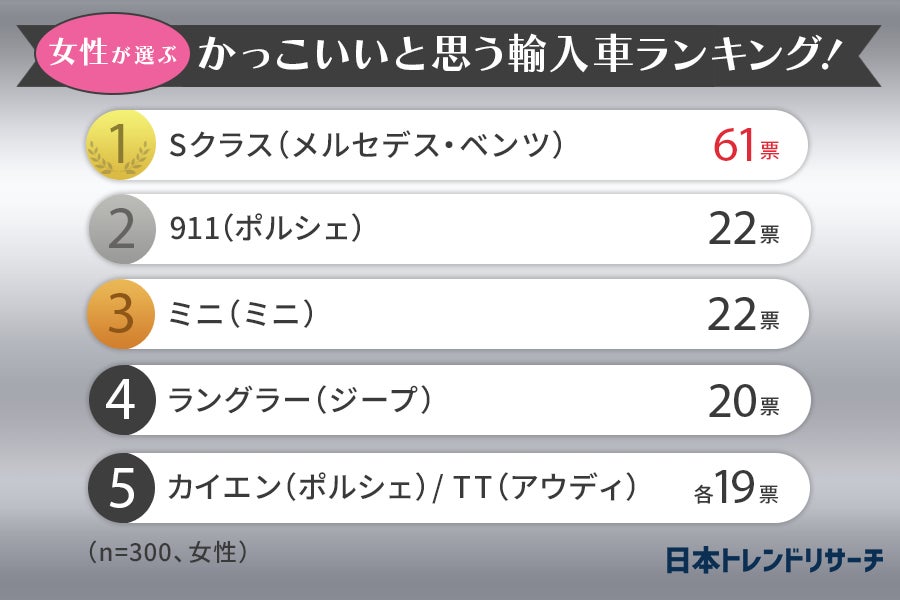 続いて、女性が選ぶ「かっこいいと思う輸入車」ランキングを理由とともに発表します。