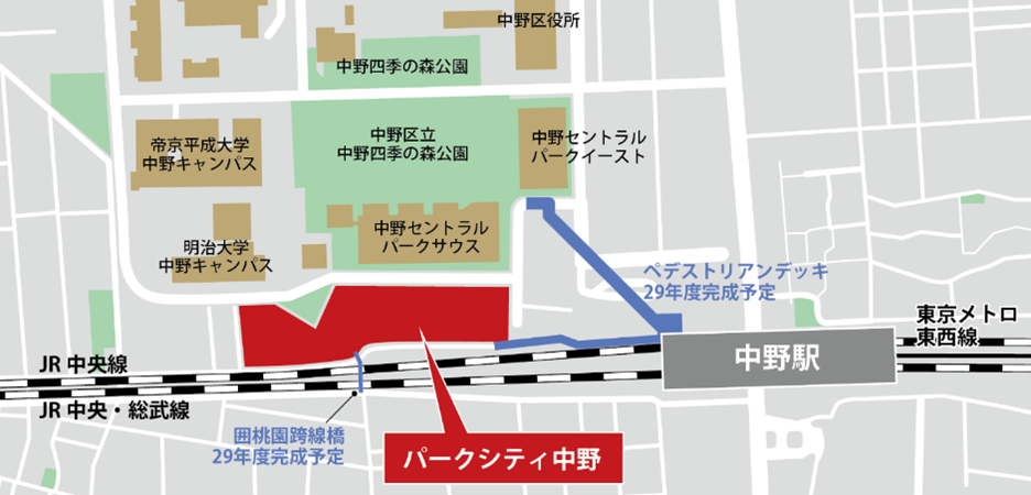 JR中央線・総武線・東京メトロ東西線「中野」駅 徒歩4分(※2)/6分 (※2)2029年度完成予定のデッキ接続後の所用時間となります。地図上の距離を計測し、80m=1分計算(端数切捨て)で表しています。 |
