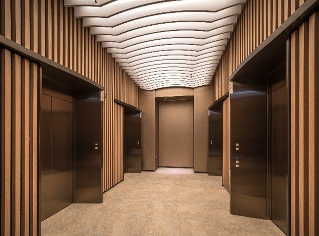オフィスエントランスは“すじ雲”をモチーフとし、流動的で柔らかな空間を表現し明るい色調を基調とすることで、開放感のあるデザインとしています。