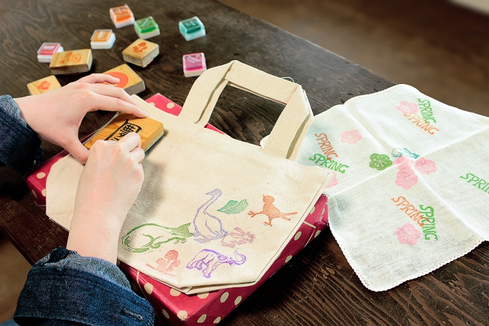 夢二デザインの消しゴムはんこを使ってオリジナルトートバック作りが体験できます。