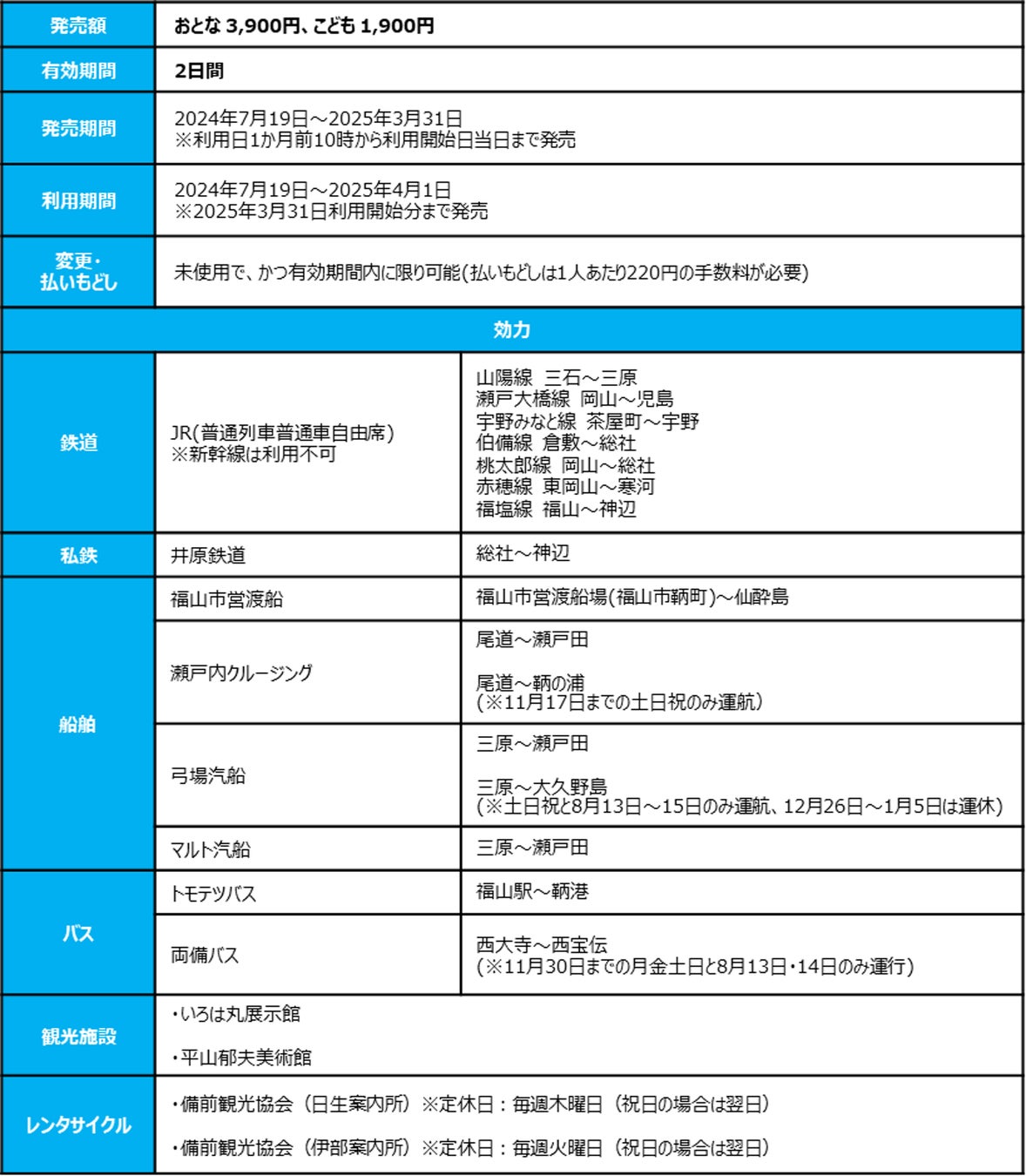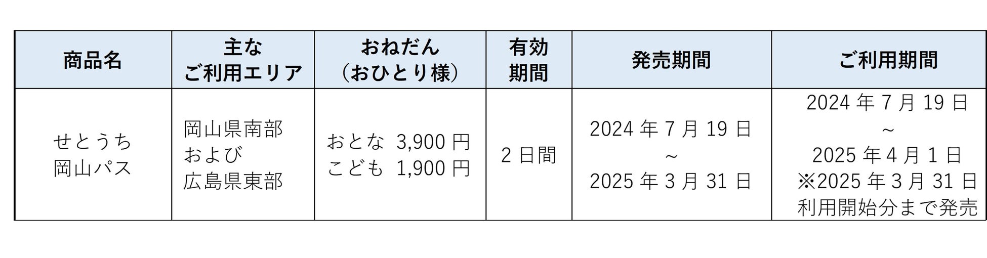 WESTER』のサービスを展開しています。この度、7月19日より岡山県南部および広島県東部をおトクに周遊できる「せとうち岡山パス」を発売します。