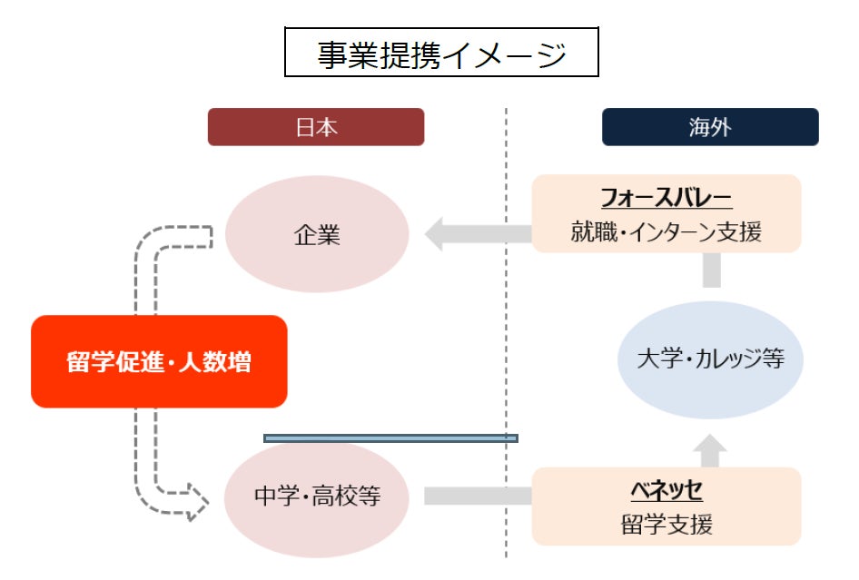 株式会社ベネッセコーポレーション(岡山県岡山市:代表取締役社長小林 仁、以下ベネッセ)は、海外大進学・留学事業において、グローバル採用支援を行うフォースバレー・コンシェルジュ株式会社 (本社:東京都千代田区、代表取締役社長:柴崎 洋平、以下フォースバレー)の日本人学生の就職・インターンシップまでを支援する事業との連携を開始します。欧米のみならず世界中に進学・留学する日本人学生に対して、進学・留学から就職・インターンシップ、入社まで一貫して支援する連続型サービスを形成する試みは、業界初(※)となります。