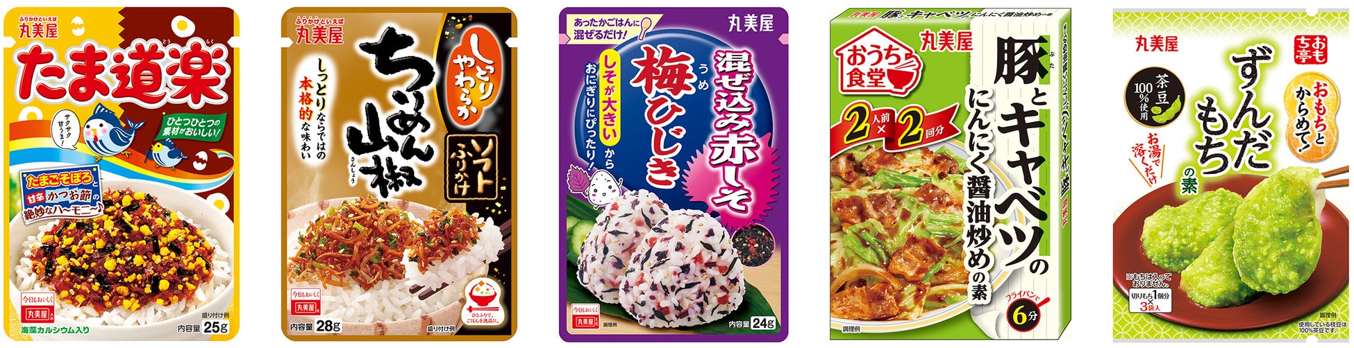 【内容】 たま道楽 N.P.、ソフトふりかけ<ちりめん山椒>、混ぜ込み赤しそ<梅ひじき>、おうち食堂<豚とキャベツのにんにく醤油炒めの素>、おもち亭<ずんだもちの素>