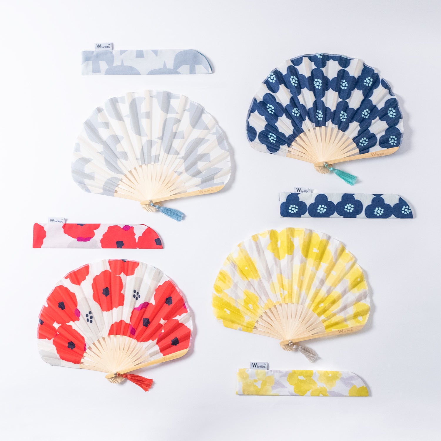 華やかで明るい色使いが印象的な布製の扇子。ケース付き。