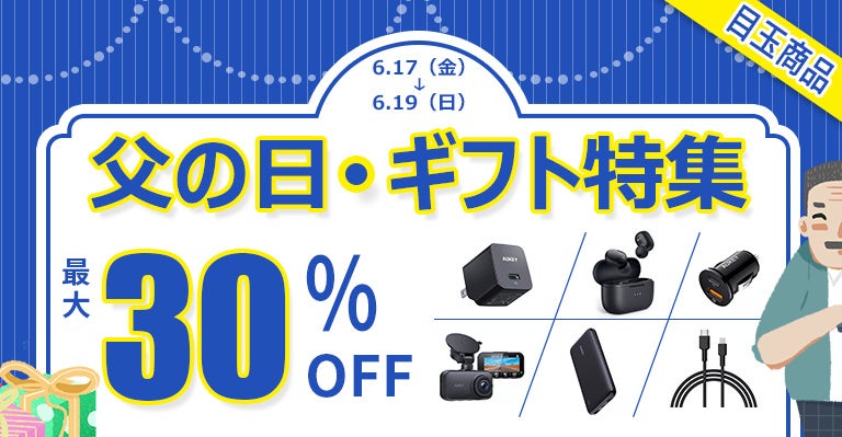 AUKEY公式サイトにて「父の日 ギフト特集」は6月17日(金)から6月19日(日)まで開催致します。急速充電器、モバイルバッテリー、充電ケーブル、カーチャージャーなどを中心に50件以上の目玉商品を30%OFF♪