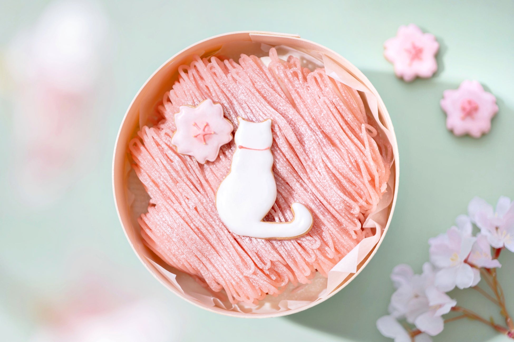 【お花見スイーツ】「ピネード」より、ねこ型のクッキーを添えた『さくらのプチモンブラン(ねこ)』をはじめ、春を華やかに彩る苺と桜をテーマにしたスイーツが新登場!