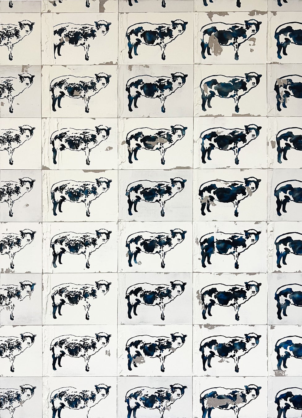 本展では、新しい取り組みとして、《⾝体による-Scrap&Build-》を発表します。クローン羊で知られる「ドリー」の図像をカーボン紙でキャンバスにひたすら複製することで、ズレやかすれのある不完全なコピーが並ぶこの作品は、クローン実験がはらむ問題を視覚的に表現しています。