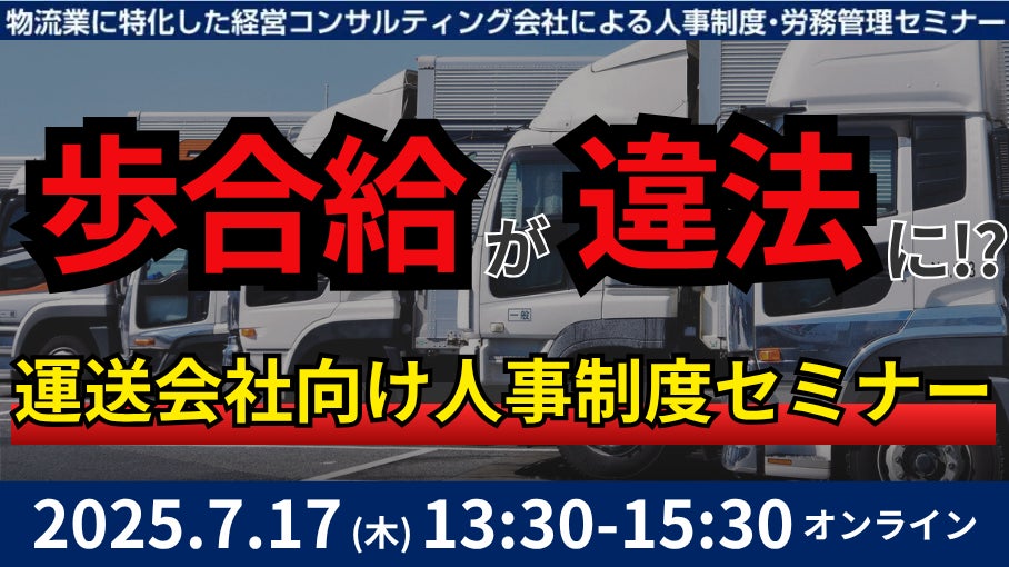 日本最大級の物流コンサルティングファーム 船井総研ロジ株式会社(本社:東京都中央区、代表:橋本直行、以下「船井総研ロジ」)は、2025年7月17日(木)13:30~15:30、 運送会社の経営者・経営幹部の方々を対象にした「第4回 未払賃金訴訟と乗務員の連鎖離職を回避する賃金制度構築セミナー2025」をオンラインで開催いたします。