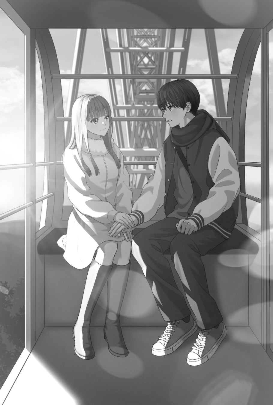 カバーおよび挿絵は、Xのフォロワー数22万人!の超人気イラストレーター、まかろんKさんが手掛けている。美しいマジックアワーの浜辺で自撮りをする主人公の男女がまぶしい。