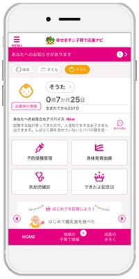 山口県防府市に採用された『幸せます☆子育て応援ナビ』は、スマートフォン・タブレット端末・PCに対応したサービスで、妊産婦と子どもの健康データの記録・管理や予防接種のスケジュール管理、出産・育児に関するアドバイスの提供、離れた地域に住む祖父母など家族との共有機能や、市が配信する地域の情報をお知らせするなど、育児や仕事に忙しい母親や父親を助けてくれる便利な機能が充実しています。