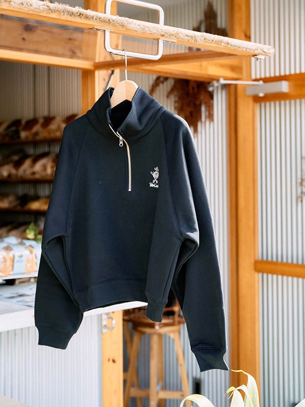 胸元にBREADMANのロゴとバゲットマンを刺繍であしらったハーフジップスウェット。袖のボリュームに合わせ、丈を短めに設定することで、女性らしい可愛いシルエットに仕上げました。