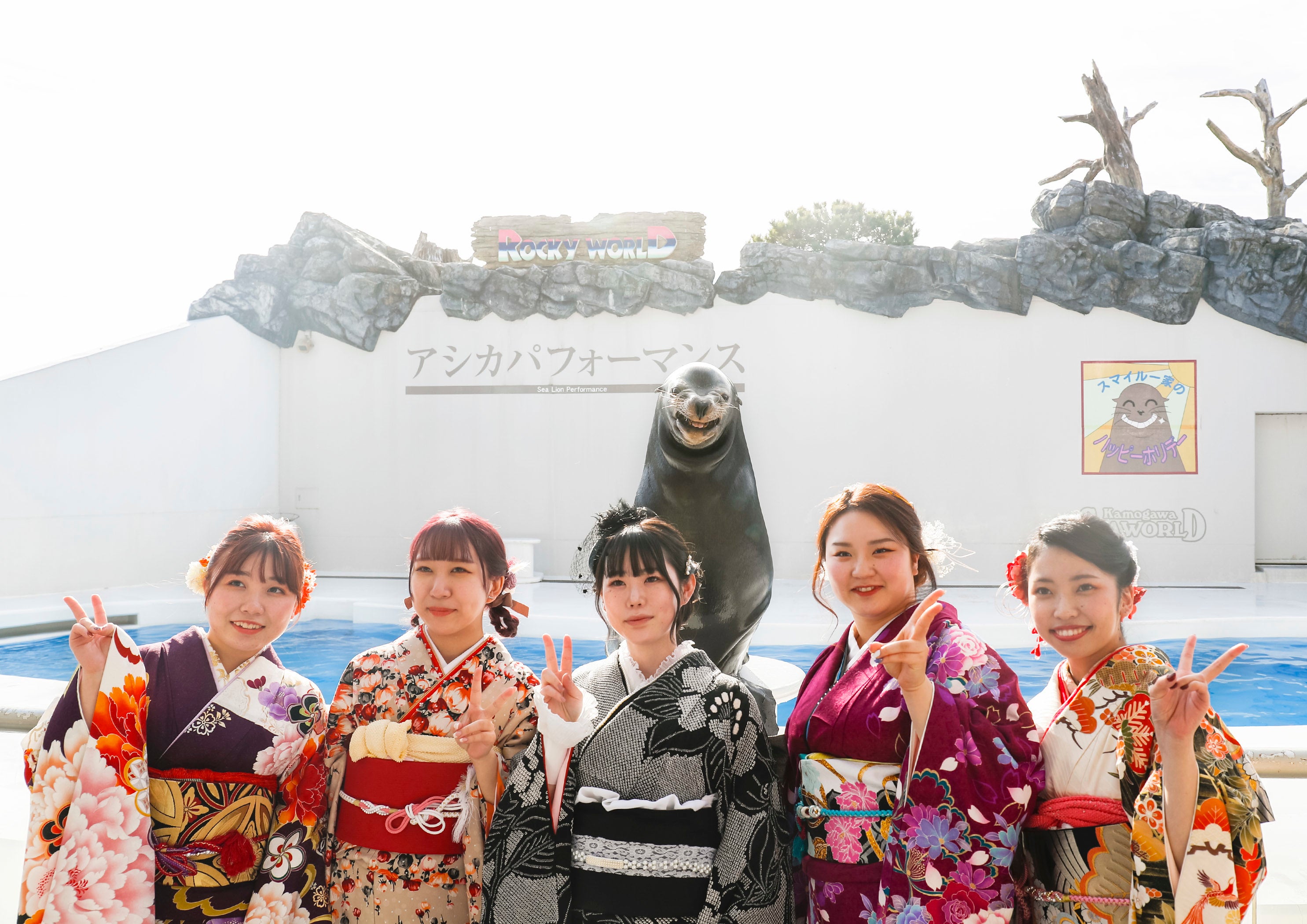 式はアシカパフォーマンス会場である「ロッキースタジアム」で午前9:20から開催され、今年は214名の新成人が参加しました。天候にも恵まれ、式は滞りなく進み、鴨川シーワールドからは「笑うアシカ」として人気の「カンジ」(オス・21歳)が新成人に「祝福の笑顔」をプレゼントしました。また、式の終了後に、晴れ着姿の新成人たちが笑うアシカの「カンジ」と一緒に思い出に残る記念撮影を行いました。