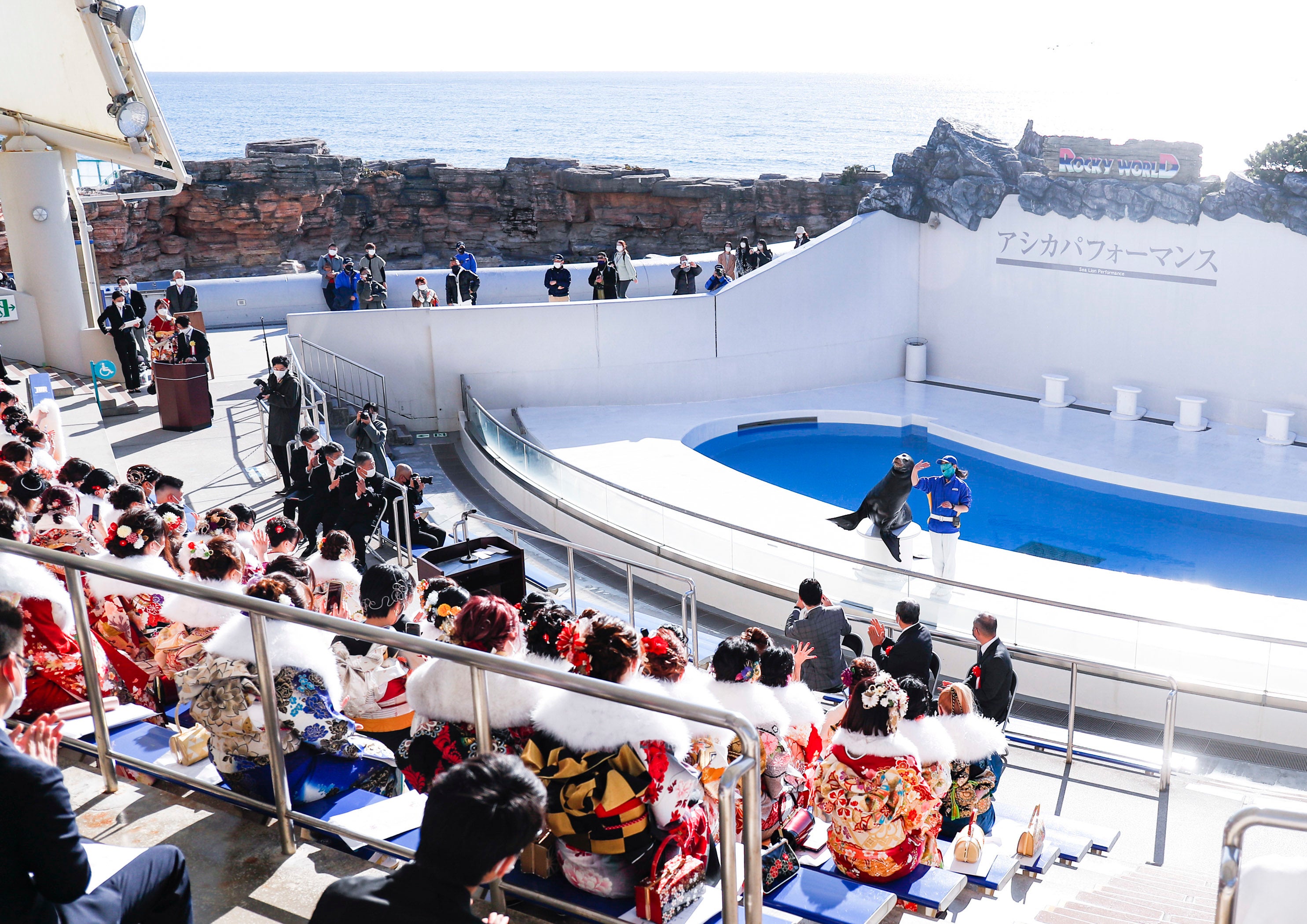水族館での成人式 「笑うアシカ」が214名の新成人を祝福