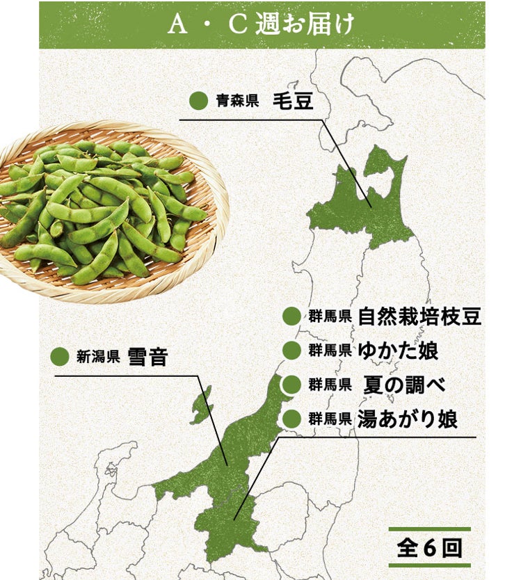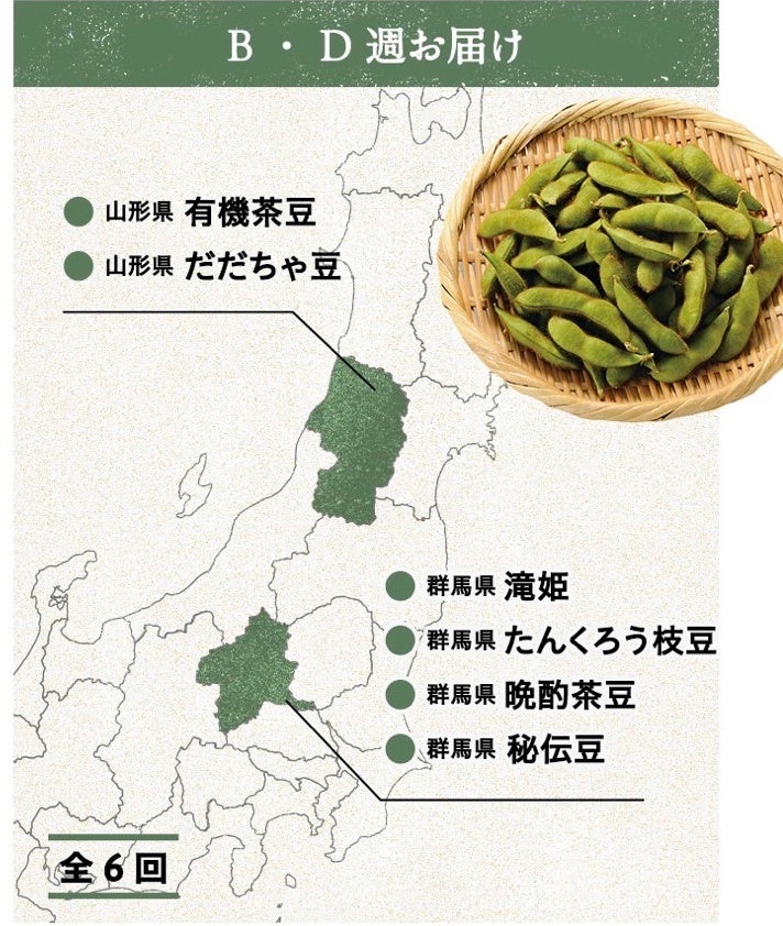 夏の調べ(群馬)、ゆたか娘(群馬)、雪音(新潟)、毛豆(青森)、滝姫(群馬)、有機茶豆(山形)、たんくろう枝豆(群馬)、だだちゃ豆(山形)、晩酌茶豆(群馬)、秘伝豆(群馬)