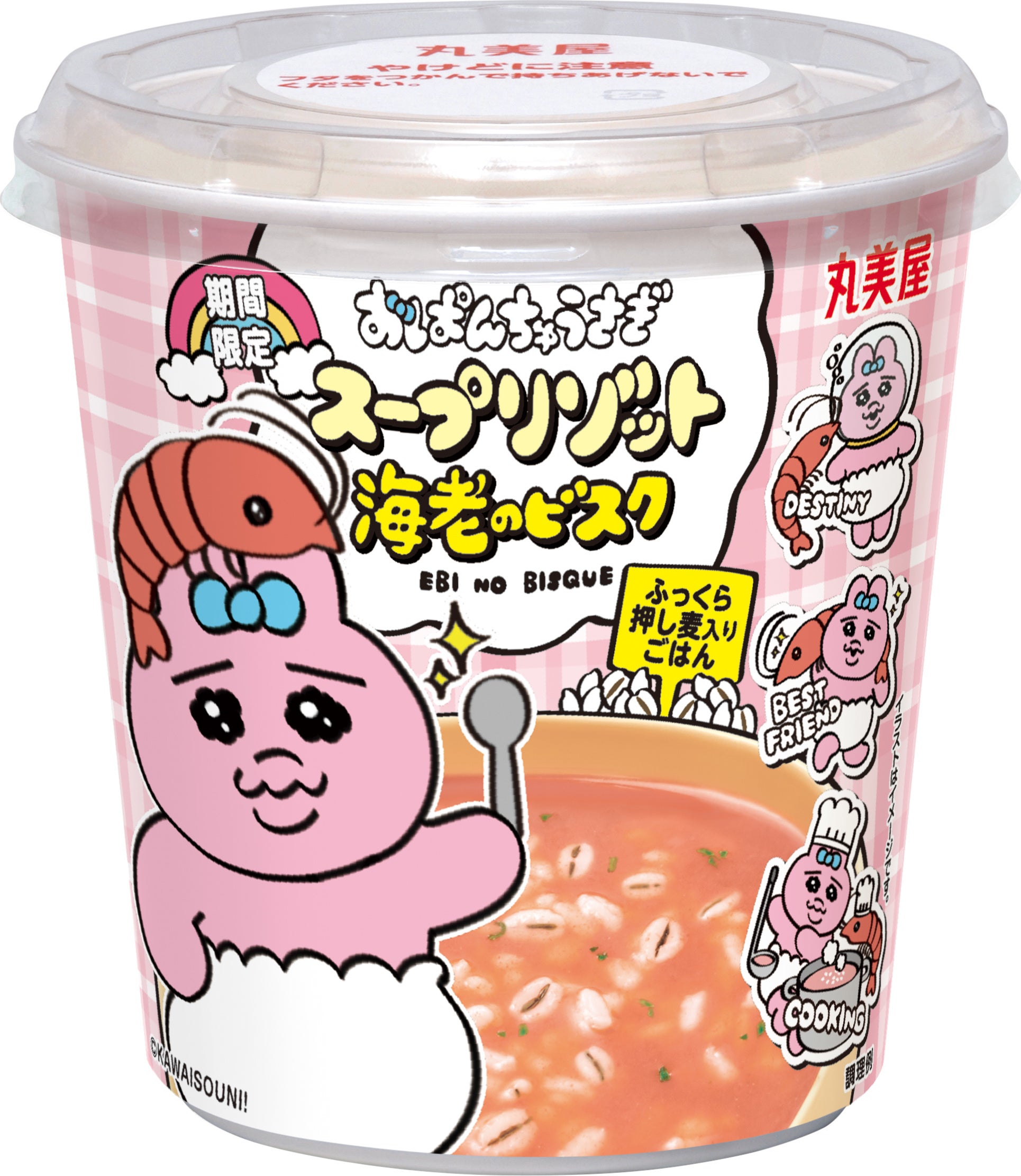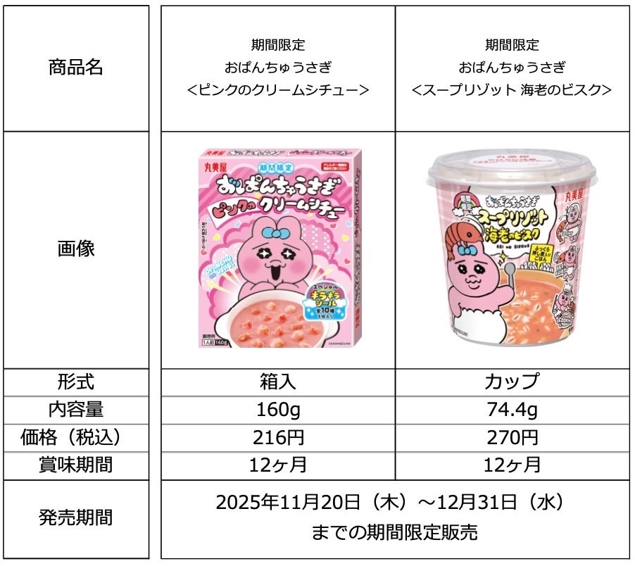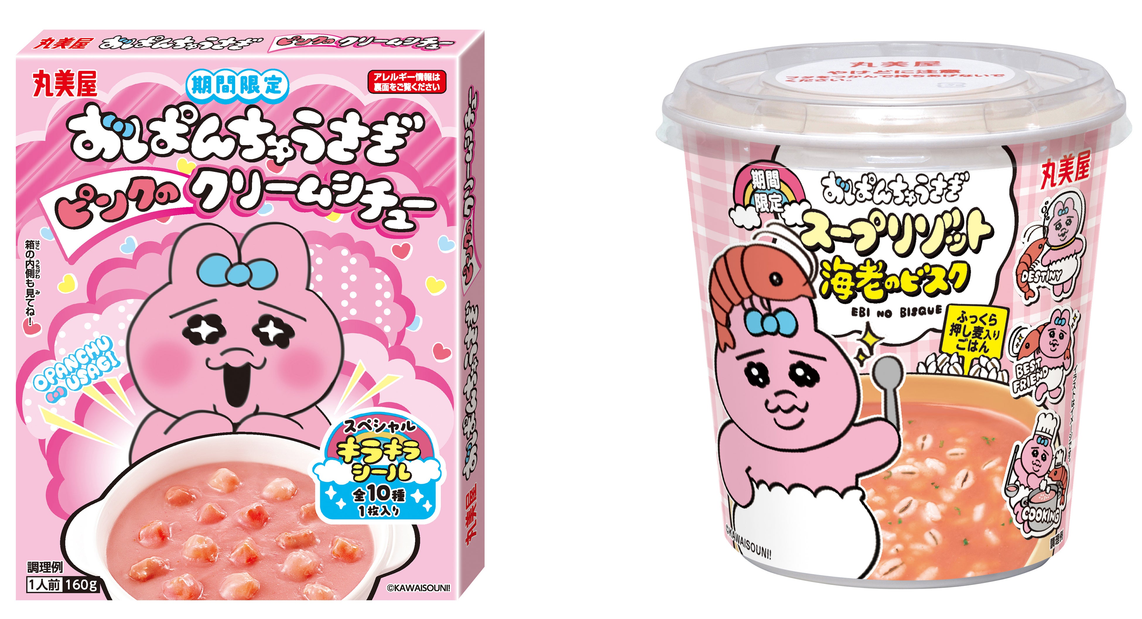 丸美屋⾷品⼯業株式会社(本社︓東京都杉並区、社⻑︓阿部豊太郎)は、SNS発の人気キャラクター「おぱんちゅうさぎ」を採用した「期間限定 おぱんちゅうさぎ<ピンクのクリームシチュー><スープリゾット 海⽼のビスク>」を2025年11月20日(木)から12月31日(水)の期間限定で発売いたします。