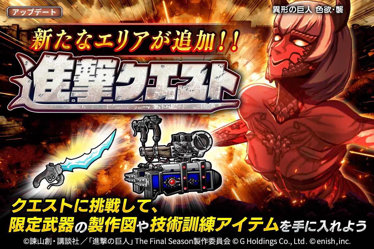 本日、2025年10月30日(木)より進撃クエストに新たなエリアが追加! クエストに挑戦して、限定武器の製作図や技術訓練アイテムを手に入れよう!