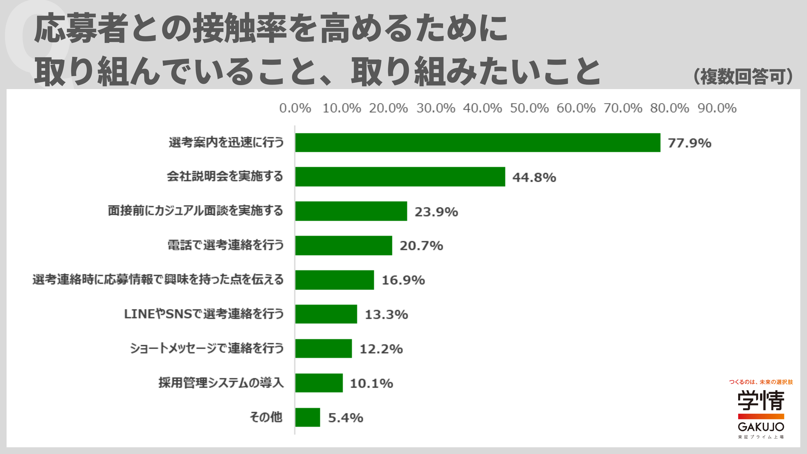 応募者との接触率を高めるために取り組んでいること、取り組みたいことは、「選考案内を迅速に行う」が77.9%で最多。次いで、「会社説明会を実施する」44.8%、「面接前にカジュアル面談を実施する」23.9%が続きました。
