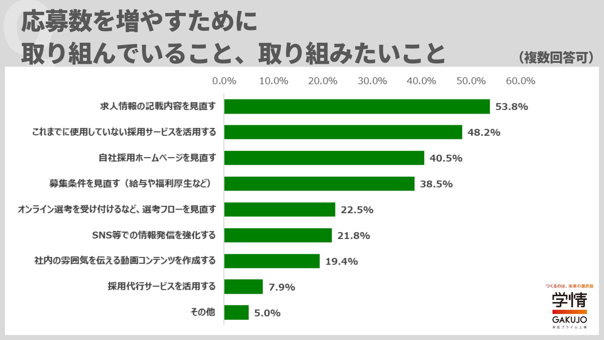 応募数を増やすために取り組んでいること、取り組みたいことは「求人情報の記載内容を見直す」が53.8%で最多。次いで「これまでに使用していない採用サービスを活用する」48.2%、「自社採用ホームページを見直す」40.5%、「募集条件を見直す(給与や福利厚生など)」38.5%が続きました。