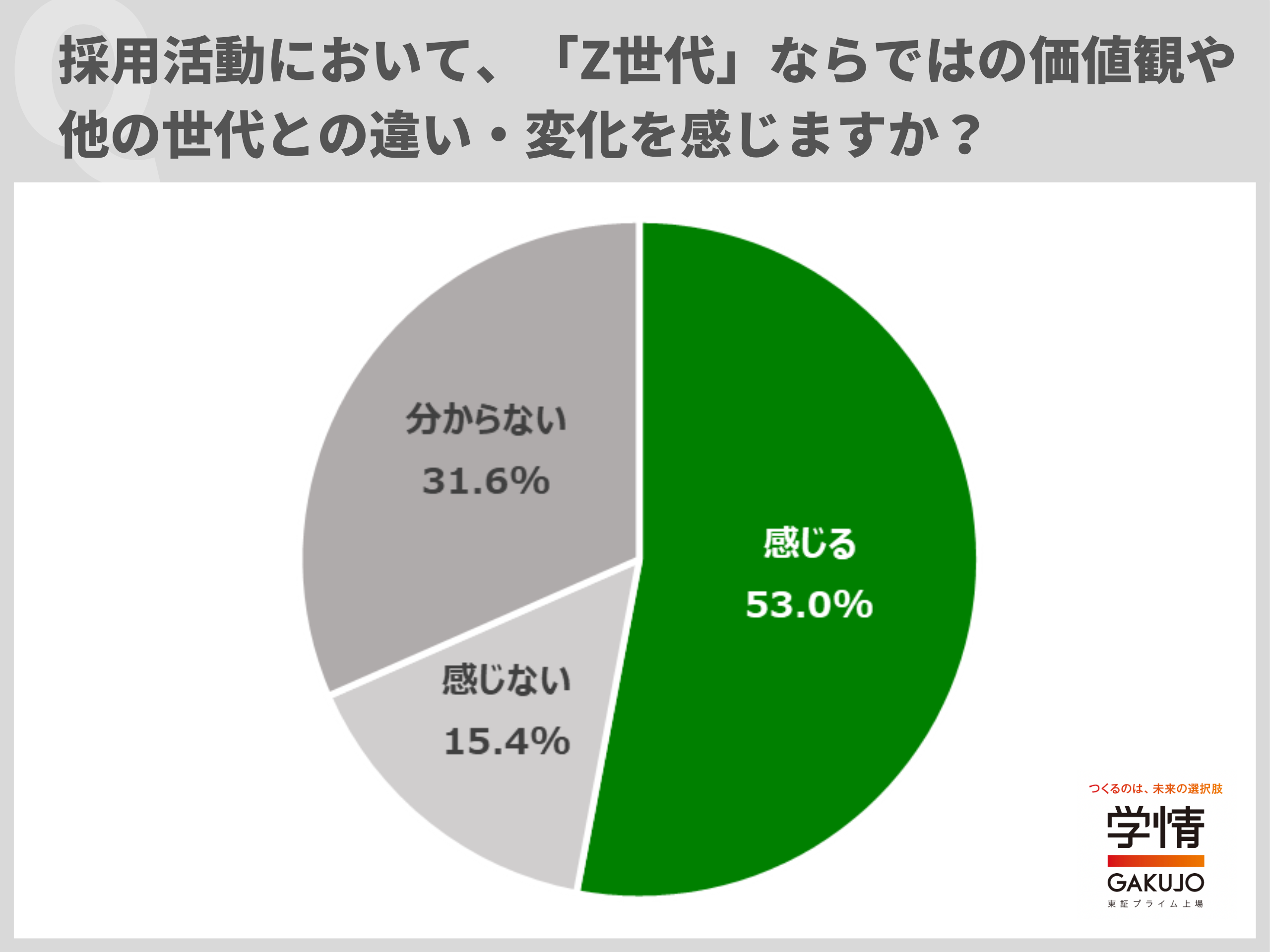 採用活動において、「Z世代」ならではの価値観や、他の世代との違い・変化を「感じる」と回答した企業が53.0%に上りました。半数以上の企業が、「Z世代」ならではの価値観や他の世代との違いを感じていることが分かります。「成長意欲が高く、経験を積むことやスキルを習得することへの関心が高い」「やりたいことや、貢献したい課題が明確だと感じる」「自身の関心と会社の方向性が合致するかを重視する人が多い」「複数回転職をすることを前提にキャリアを考えている傾向」「効率を重視する傾向が強く、情報処理能力に長けている」などの声が寄せられました。