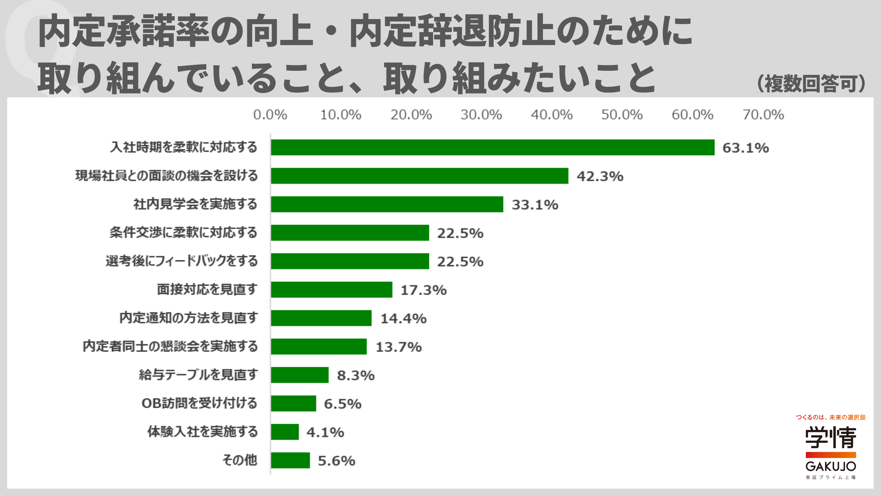 内定承諾率向上のために取り組んでいること、取り組みたいことは「入社時期を柔軟に対応する」が63.1%で最多。次いで、「現場社員との面談の機会を設ける」42.3%、「社内見学会を実施する」33.1%が続きました。