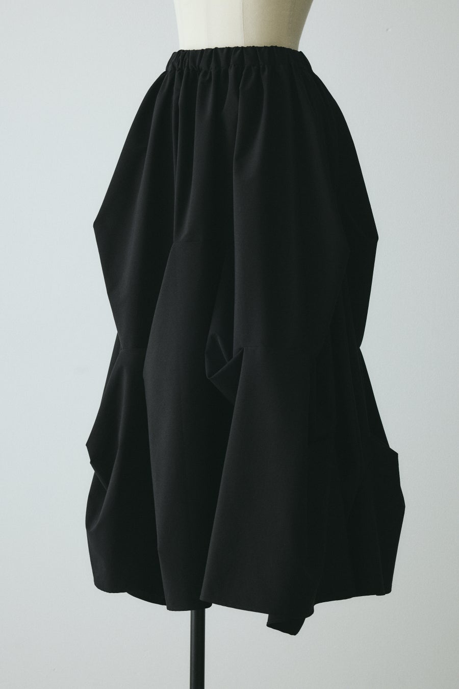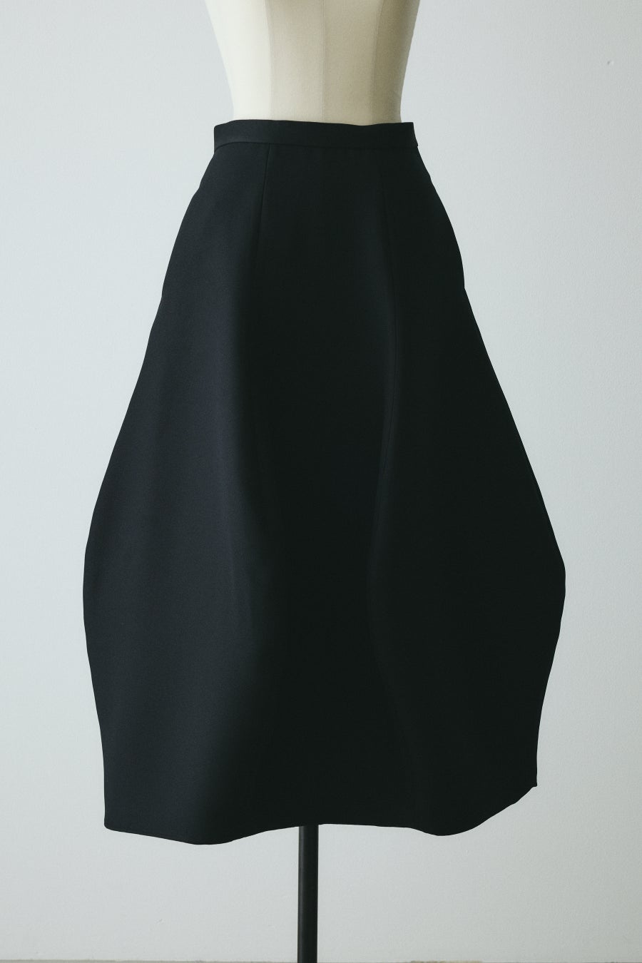ラウンドのモチーフを繋ぎ合わせた立体感のあるスカート。膨らみのある生地を使用し、シルエットにこだわった一枚。膝の辺りに膨らみのトップを持ってくることでバランスもとりやすくなっています。リサイクルポリエステルを使用したアムンゼン組織の三重織です。打ち込みのバランスにより、張り感や膨らみ感、軽さを兼ね備えた厚地素材。